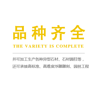 公司主營山東白麻、黃金麻、珍珠花、晶白玉、櫻花紅、五蓮紅、五蓮灰、魯灰、山東黑、石島紅、等各種花崗巖板材,并可加工生產各種異型石材、石材圓柱等,還可承接高標準、高難度浮雕雕刻、園林工程。現已形成年產量30多萬平方米的加工規模。